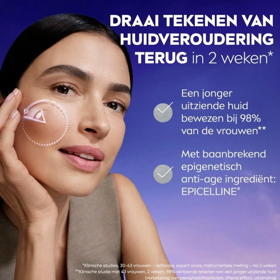 Dankzij de gepatenteerde Age Clock-technologie en krachtige werking van epicelline draait dit Nivea Cellular Epigenetics Ultiem Huidverjongend Serum tot wel tien zichtbare tekenen van huidveroudering terug in twee weken.