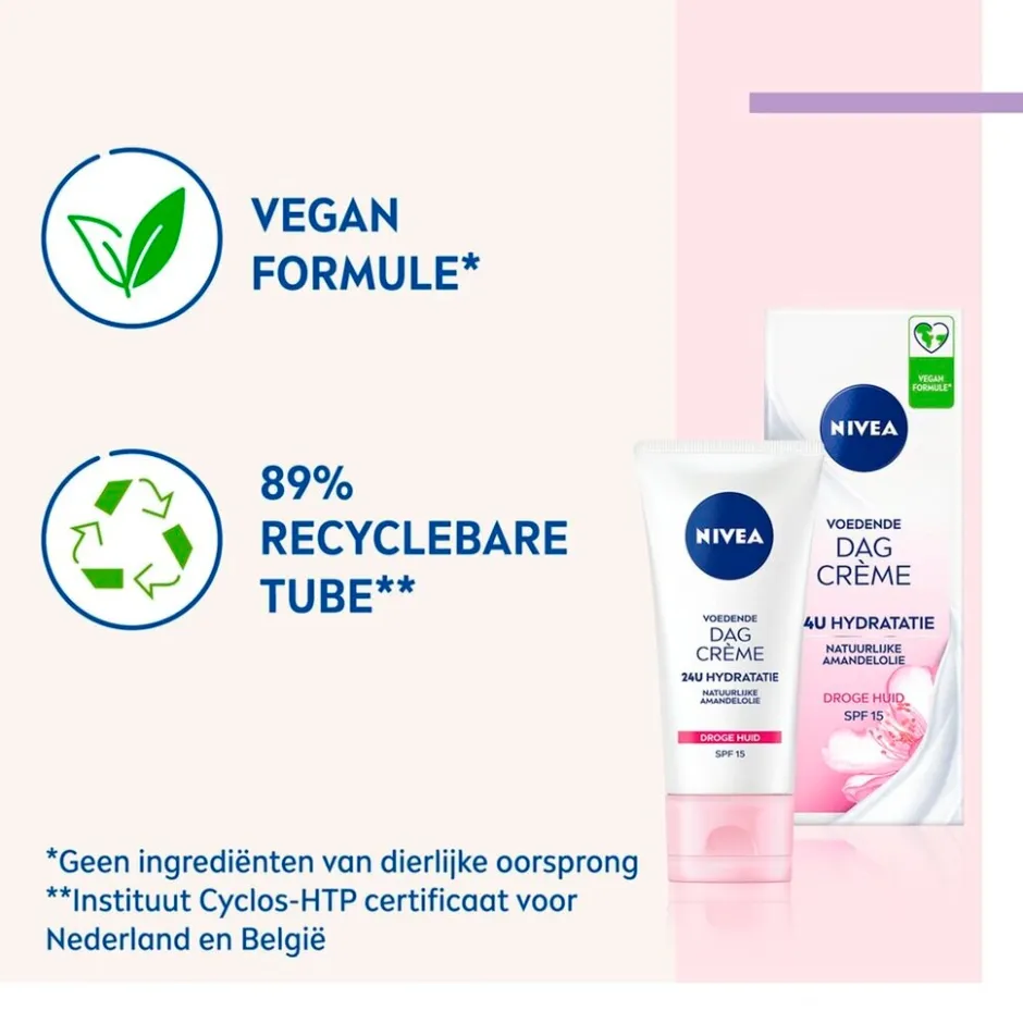 NIVEA Voedende Dagcrème met SPF15 is een sterk voedende crème dankzij de toevoeging van amandelolie. Deze olie trekt snel in, waardoor je geen last hebt van een vettig residu. Tegelijkertijd heeft zoete amandelolie een kalmerende en beschermende werking. De crème heeft een vegan formule* en de tube is bovendien 89% recyclebaar.**