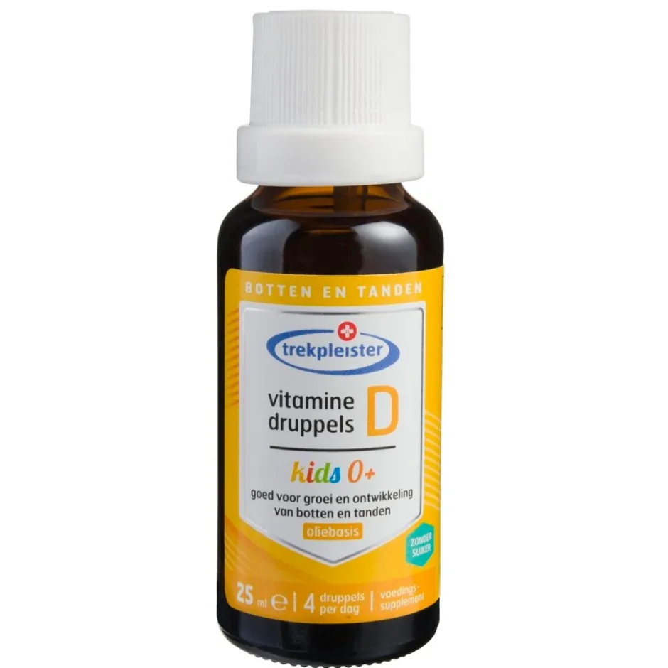 Trekpleister Vitamine D3 Druppels op Oliebasis bevatten vitamine D die jonge kinderen in de groei hard nodig hebben. De Gezondheidsraad adviseert kinderen van 0 tot 4 jaar per dag 10 ug extra vitamine D te geven.